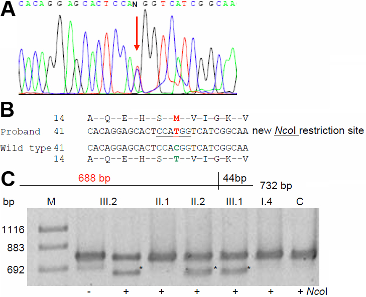 amino acid alteration at codon 19 (T19M). C: Restriction analysis with (+) or without (-) the enzyme NcoI in members of the family leads to an additional fragment of