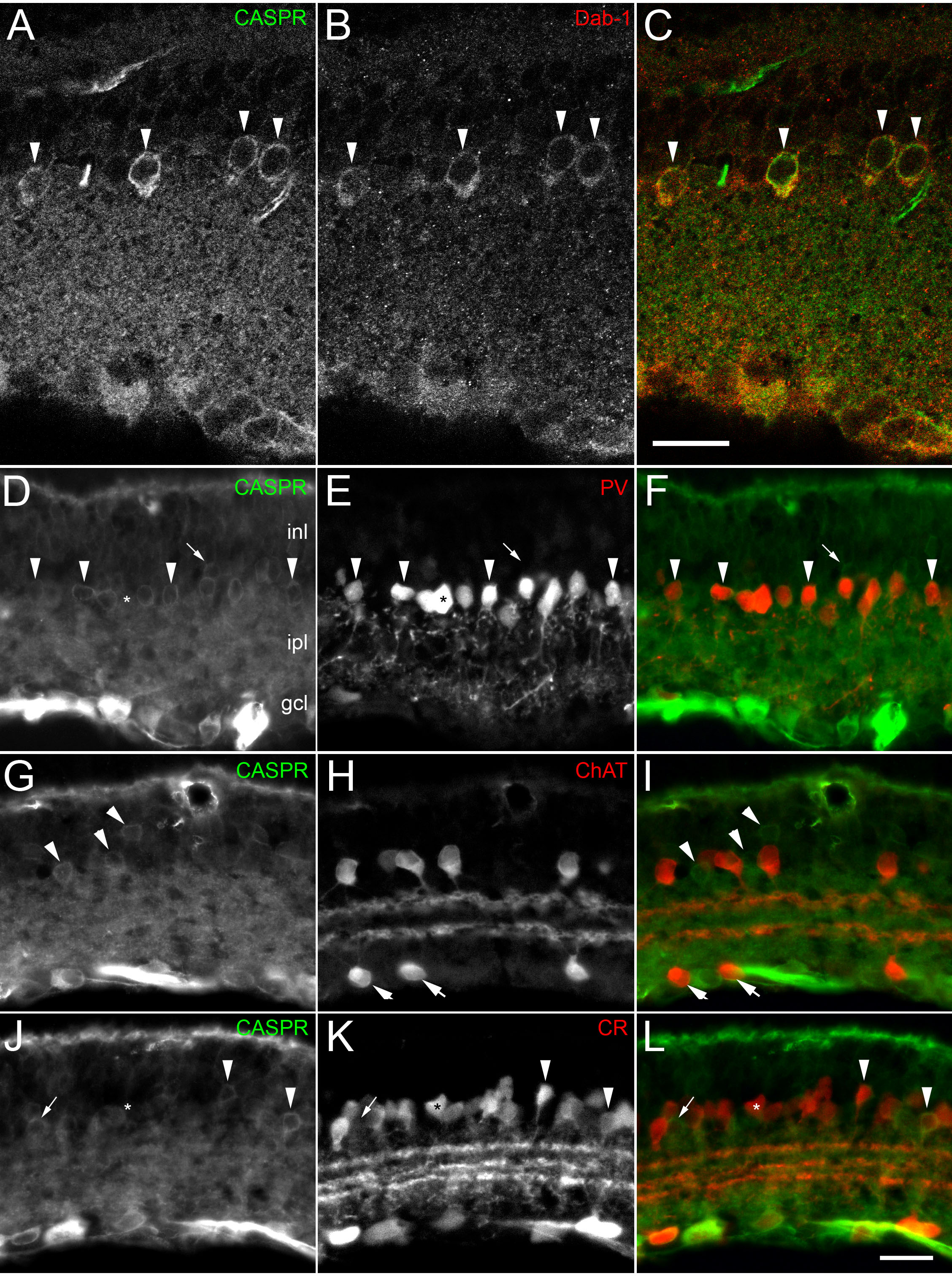 section demonstrating co-localization of Caspr labeled amacrine cells