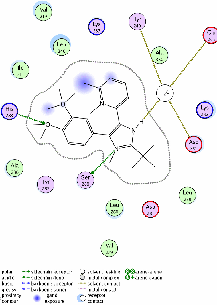 Additionally, a water molecule seems to form a hydrogen-bonding bridge between SB-505124 and amino acids Asp-351, Glu-245