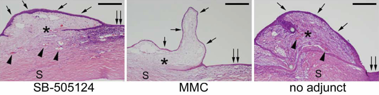 cells and mild scarring were observed in the subconjunctival space of eyes in the GFS with SB-505124 (left panel) or the MMC