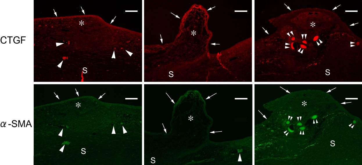 Figure 9. Immunofluorescence for CTGF and α-SMA in tissue sections from eyes five days after glaucoma filtration surgery (GFS). The