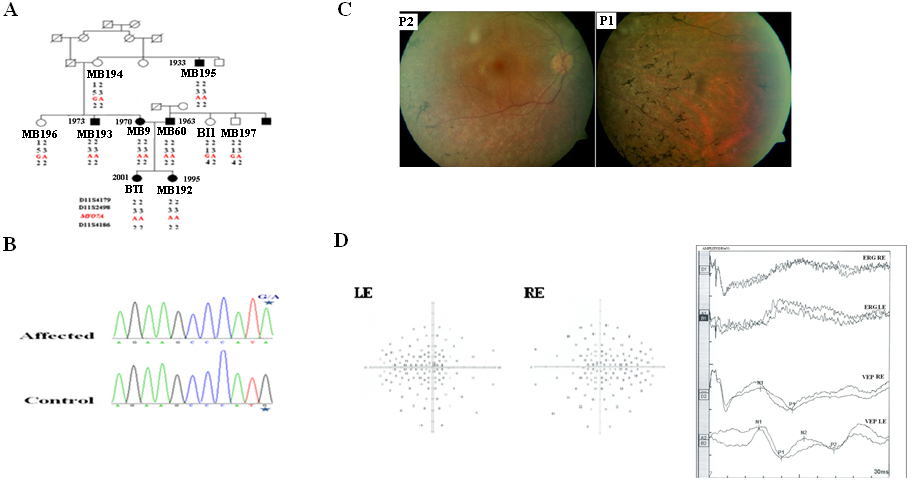 indicates the position of the homozygous mutation. C: Fundus photographs in 40-year-old (P1: MB9) and 47-year-old (P2: MB60) patients showed variability in the severity of retinitis