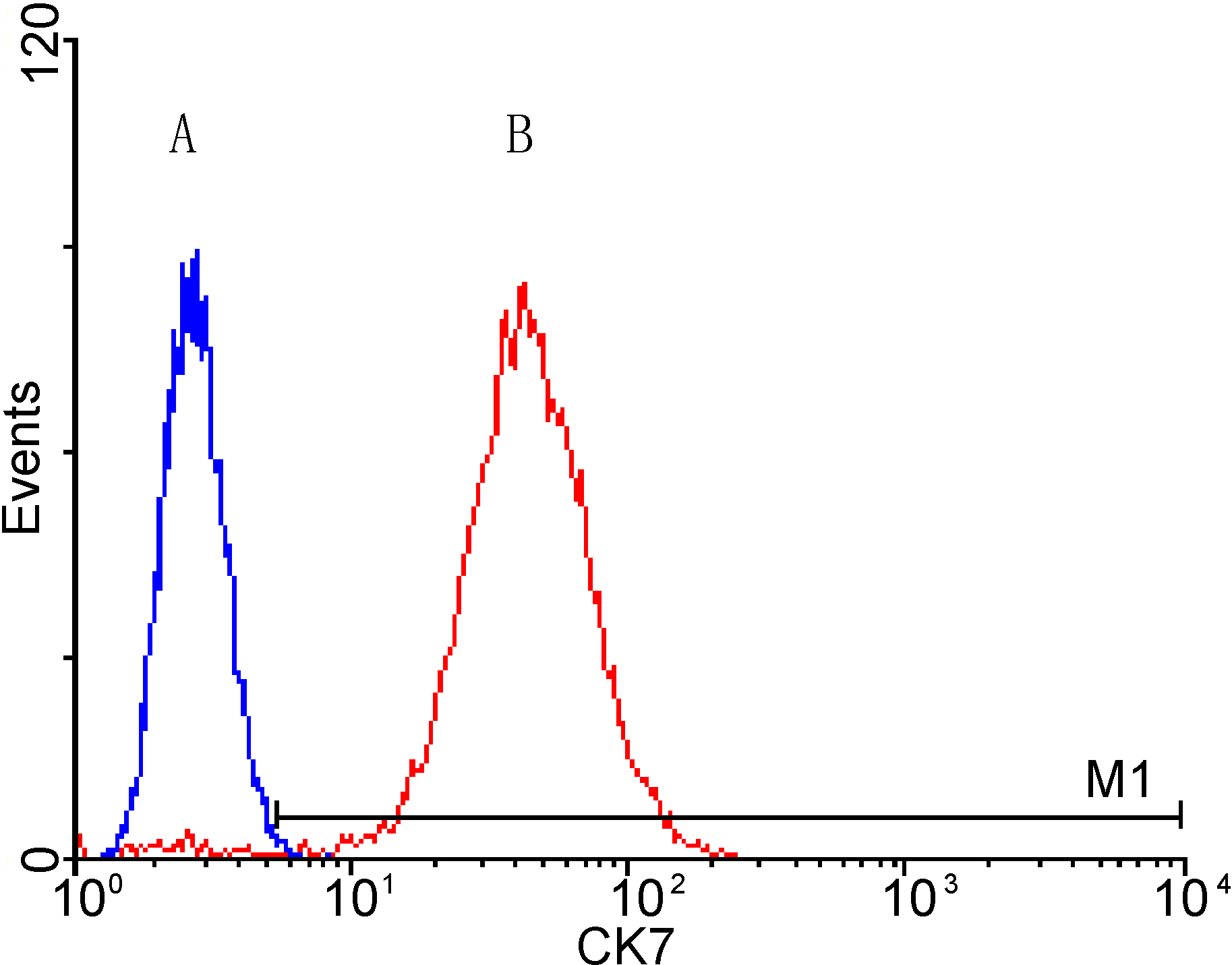 : with antibody against CK-7. Numenator histogram gated events: 9,806. Denominator histogram gated events: 10,000% Gated: 98.06%.