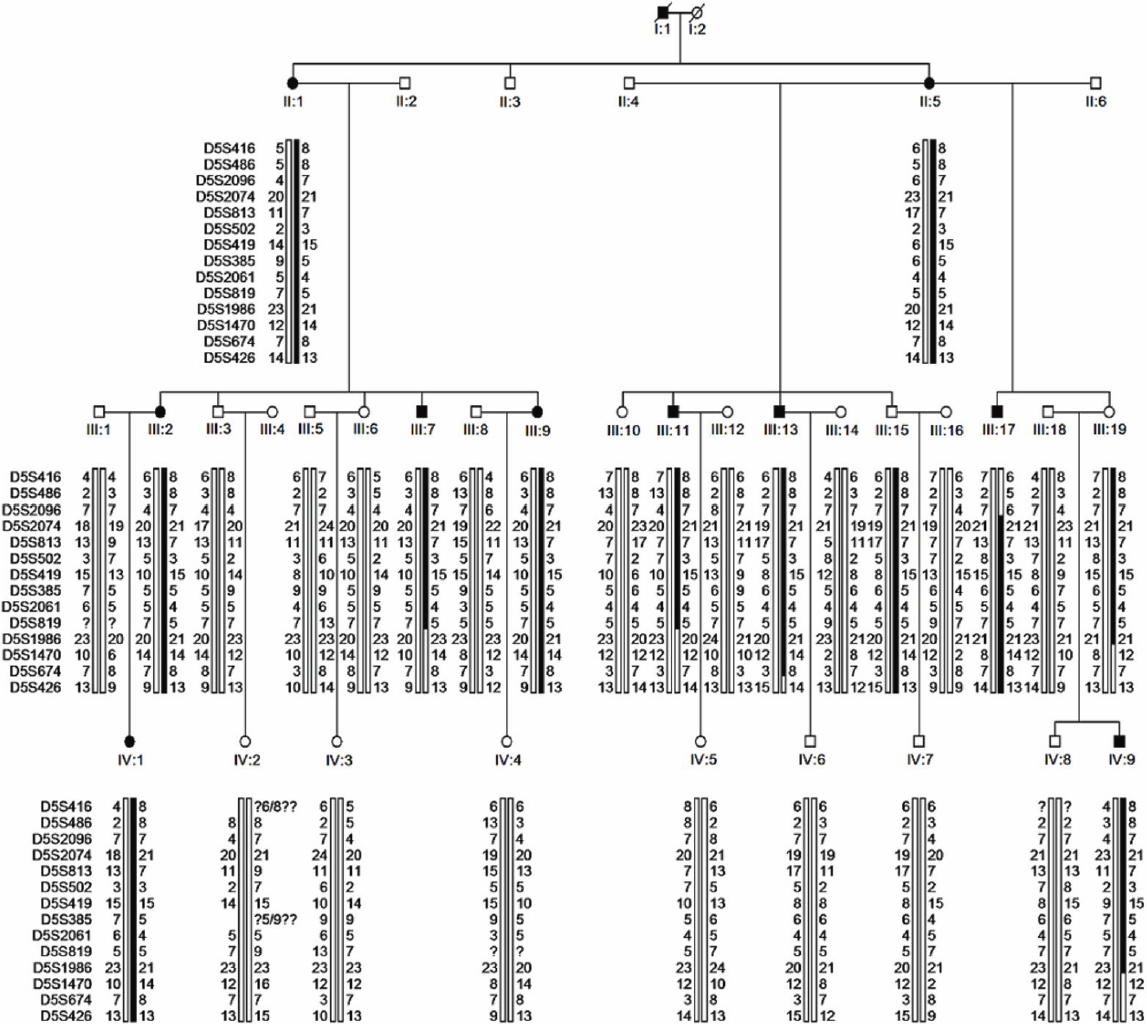 was indeterminate (denoted by question marks) for markers D5S416 and D5S385. Individual III:17 was recombinant for the telomeric