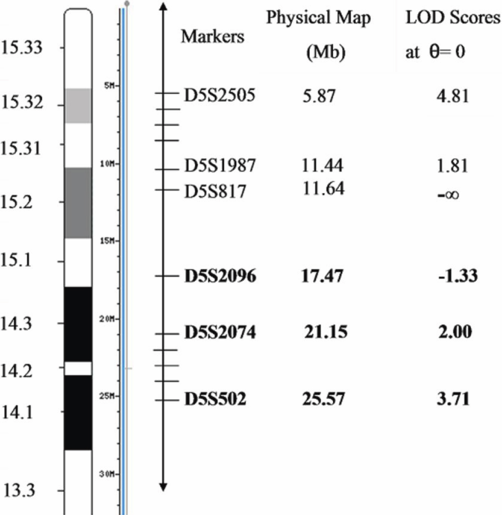 three markers were identified in the present study (bold text): D5S502 was the marker with the highest two-point LOD score