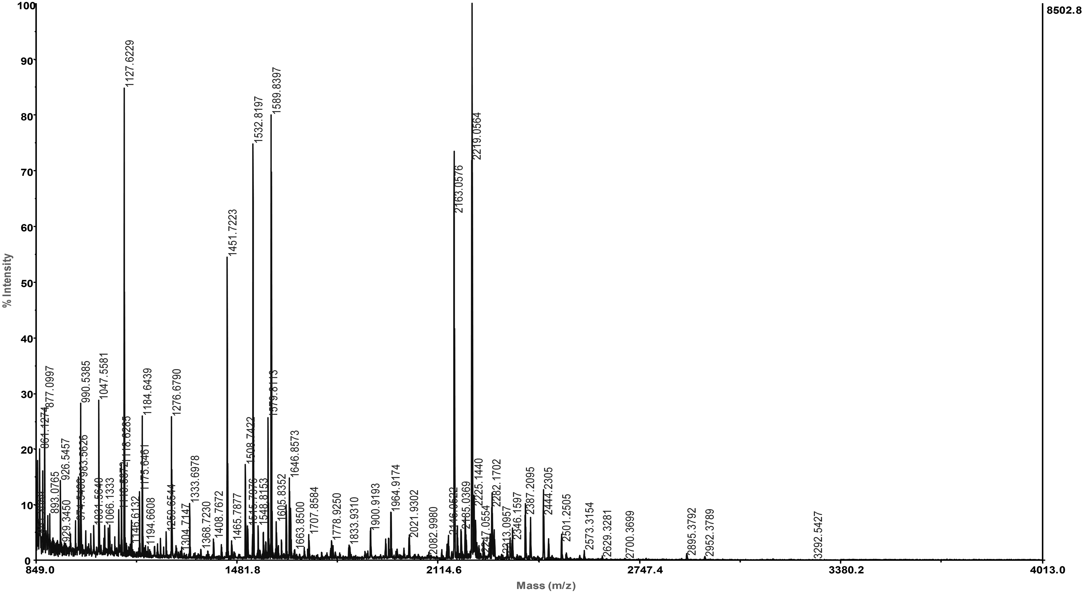 A typical profile of molecular mass of tryptic fragments of zinc- α2-glycoprotein (ZAG) during analysis by MALDI-TOF mass spectrometry.