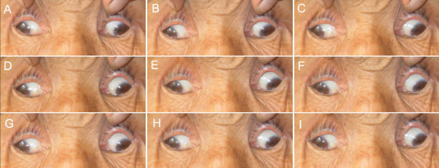 ophthalmoparesis, infraducted eyes in primary position, exotropia, and