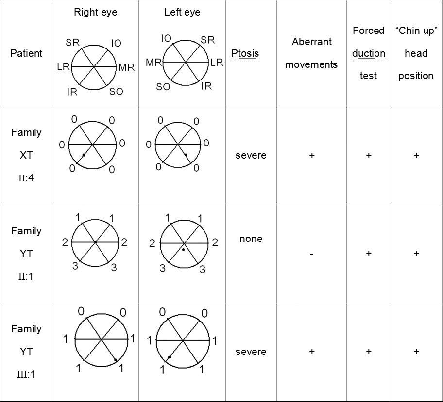 MR=medial rectus; SO=superior oblique; IO=inferior oblique. The presence of ptosis, aberrant eye movements, forced duction