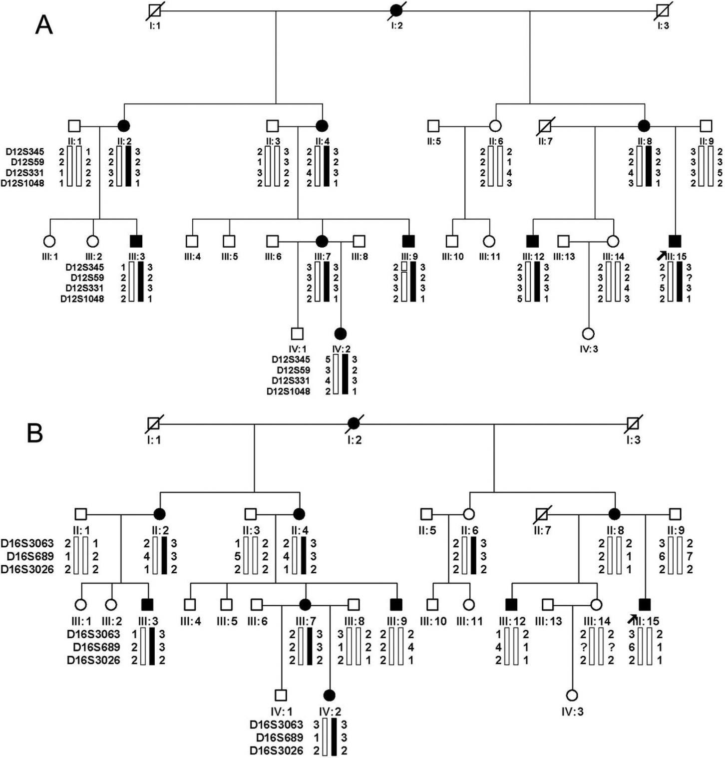 of family XT at the FEOM1 and FEOM3 loci. Black symbols identify