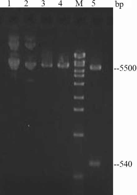 Restriction enzyme digestion of recombinant plasmid pBTLA. M: DNA marker. 1: pBTLA 2: pcDNA3.1 3: pBTLA/HindIII 4: pBTLA/XbaI 5: pBTLA/HindIII+XbaI.