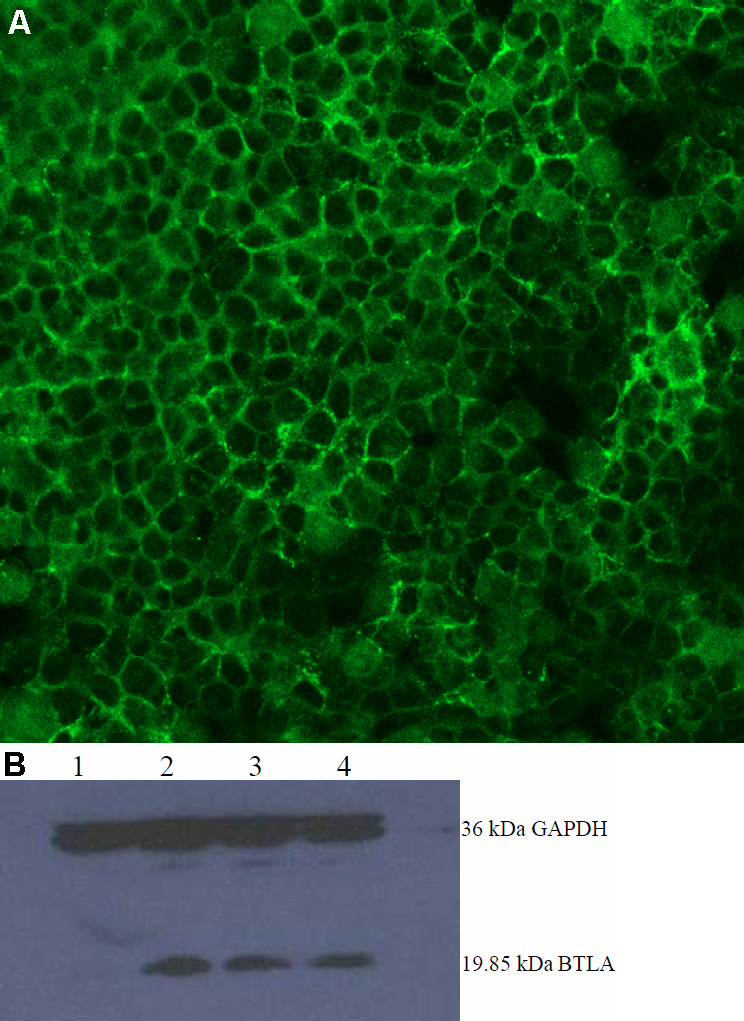Green: BTLA protein-positive HEK293 cells transfected with pBTLA in fluorescence microscope. B: western blot result of recombinant plasmid pBTLA. HEK293 cells were transiently transfected with 1 μg of pBTLA. Cells were