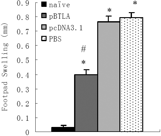 Figure 7. pBTLA plasmid treatment suppresses the systemic DTH responses of mice. pBTLA and pcDNA3.1 treated mice received 100 µg of