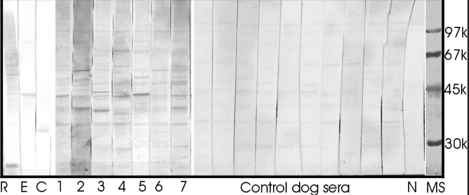 1 to 7; control dog sera are labeled as “control dog sera,” Lanes R-