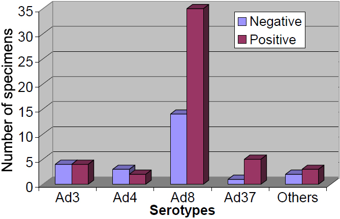 Distribution of immunochromatography result according to adenoviral serotypes among 73 ocular specimens.