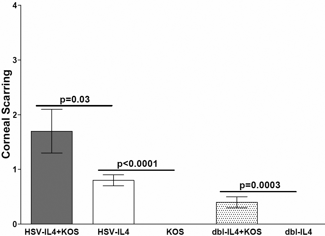 infected with HSV-IL-4+KOS, HSV-IL-4, KOS, dbl-IL-4+KOS, and dbl-IL-4, respectively.