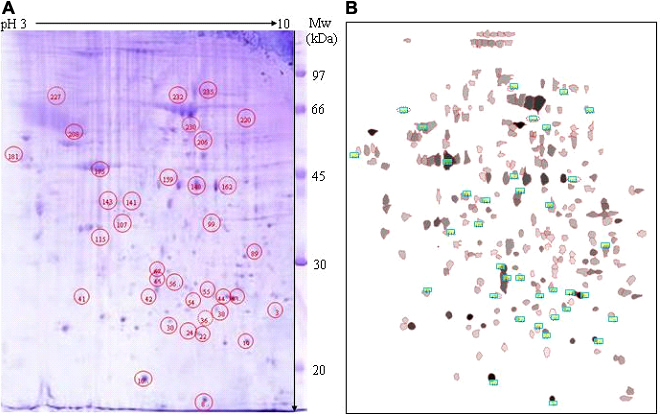 Figure 1. Protein profiles of the posterior sclera on 2-DE. The 2-DE distributing profile of the differentially expressed protein spots