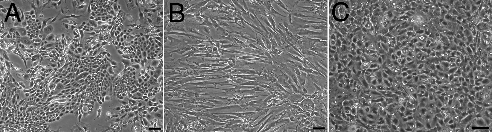 : Corneal epithelial cells co-cultured with an irradiated 3T3 feeder layer. B: Stromal fibroblasts.