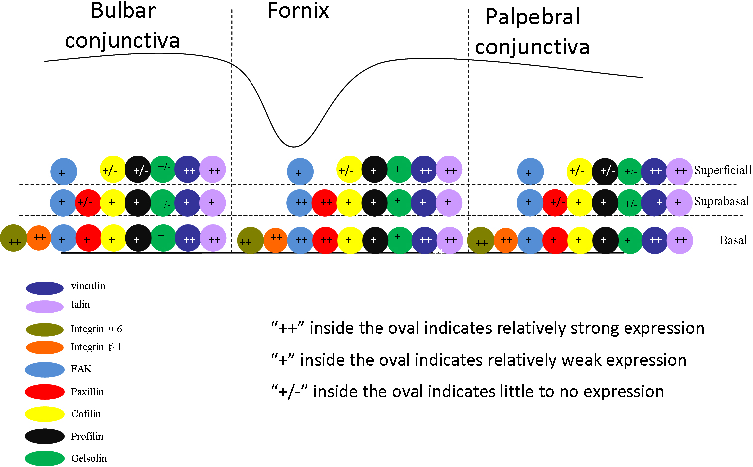 Summary of the microfilament regulators distribution in the forniceal, palpebral and bulbar conjunctival epithelia.