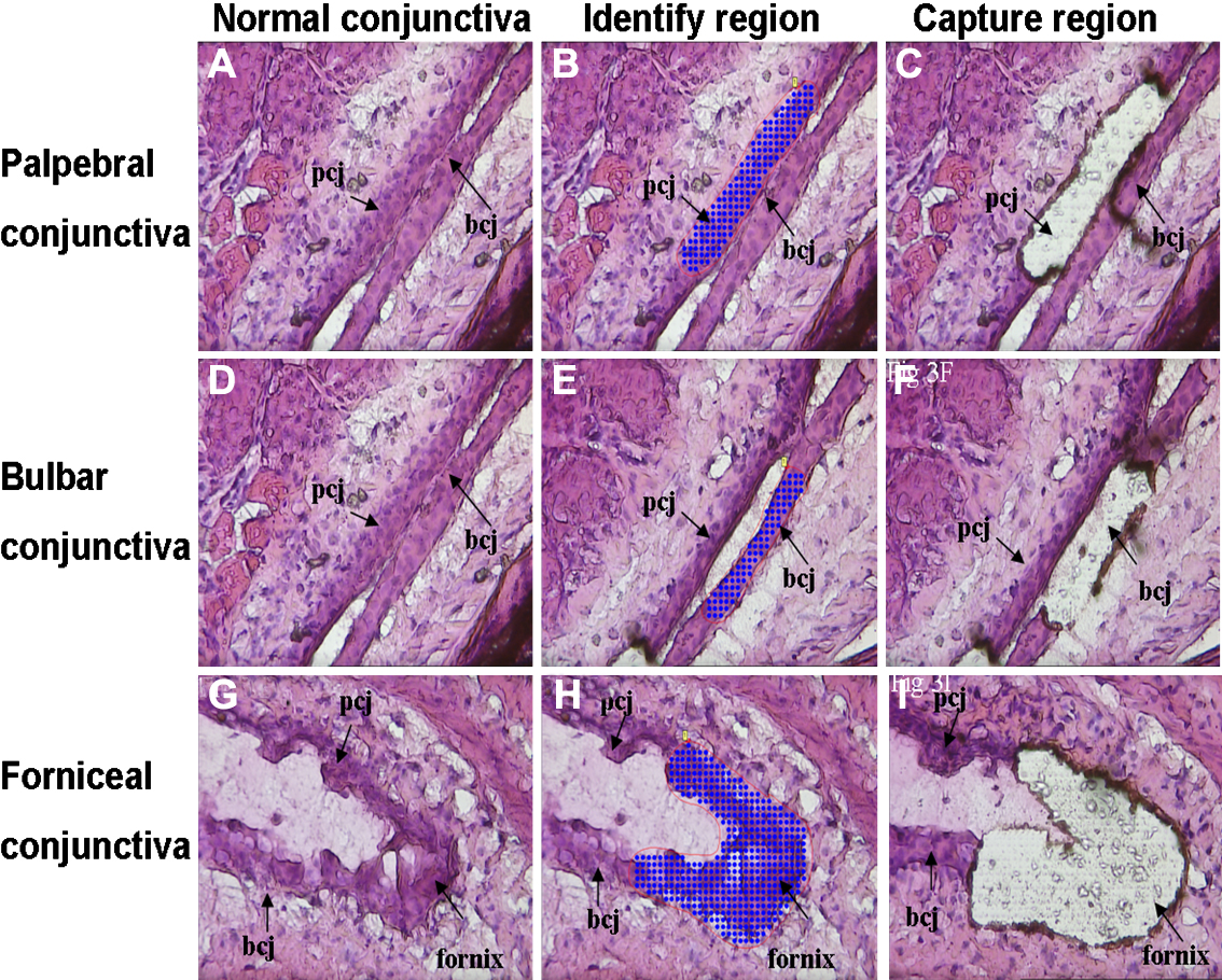 Figure 3. PALM laser dissection. A, D, G: OCT-embedded mouse eye tissue was cut at 10 μm, fixed and stained with hematoxylin and Eosin. B, E, H: Palpebral, bulbar and forniceal conjunctival epithelium region were identified and circled. C, F, I: The selected region was cut from the surrounding cells, and the same region was captured leaving a clear margin of surrounding