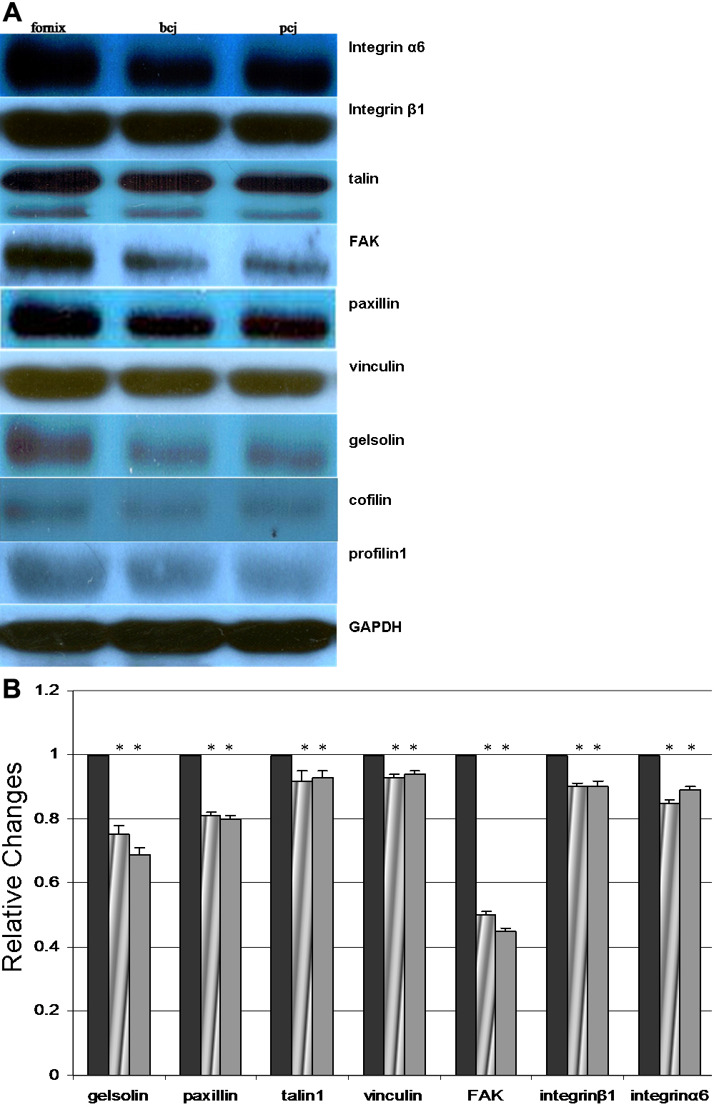 Figure 5. Western blot analysis. GAPDH was used as the loading control. A: The proteins identities are indicated on the right. B: Band intensity was quantified by densitometry and the fold difference of each microfilament regulator in the conjunctival