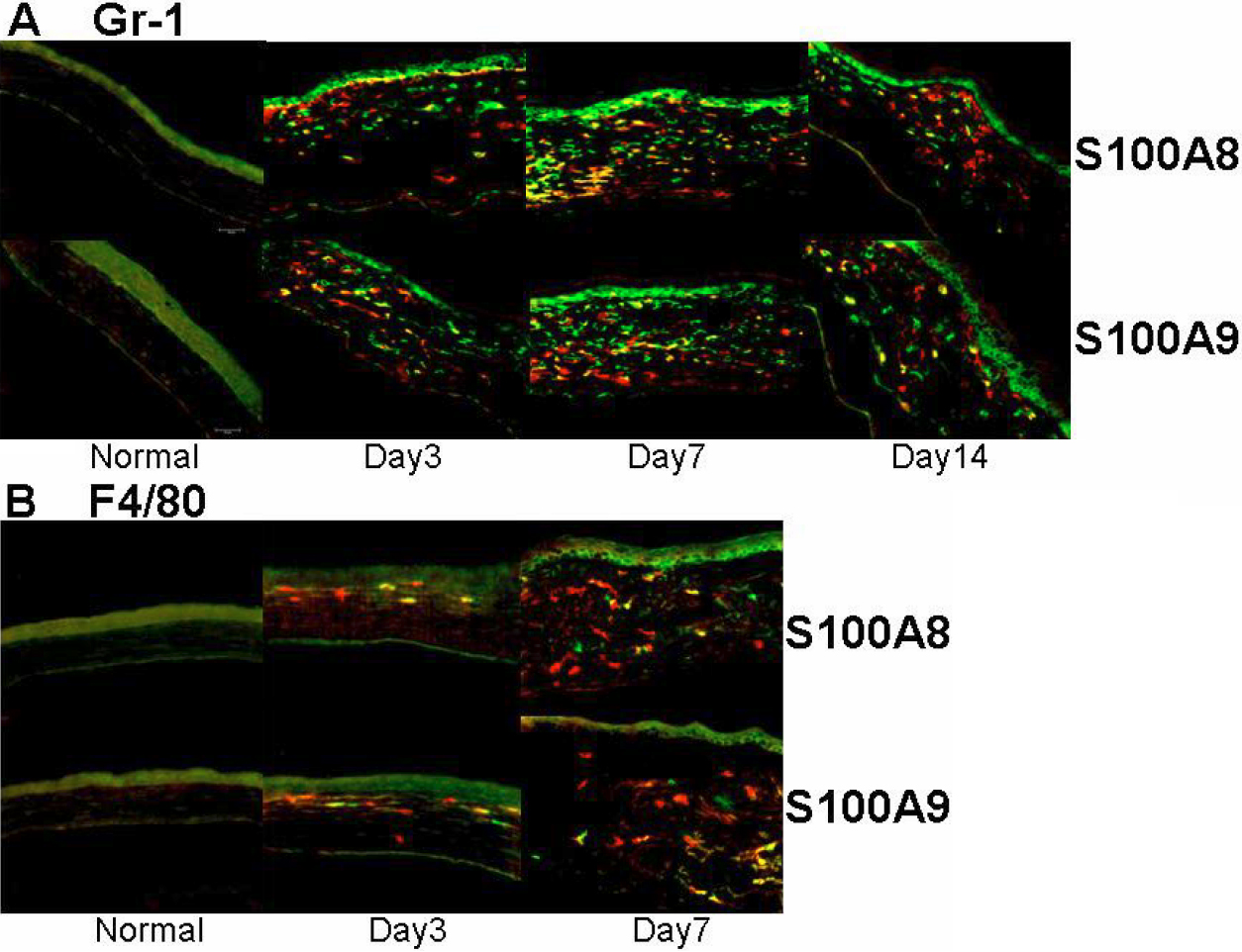 Figure 2. Immunostaining for S100A8, A9, and cellular markers in murine corneas. Neutrophils and macrophages were stained green via
