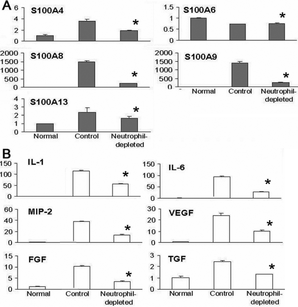 Figure 4. Effects of neutrophil depletion on the expression of S100A proteins and cytokines in neovascularized corneas at day 5 after