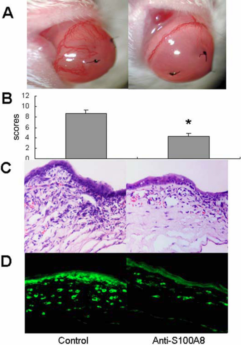 taken under a slit lamp (A), disease scores (B), infiltration under HE staining (C), and staining for neutrophil marker Gr-1 (D); one representative cornea from three animals in each group; the asterisk indicates a p<0.05 versus control.