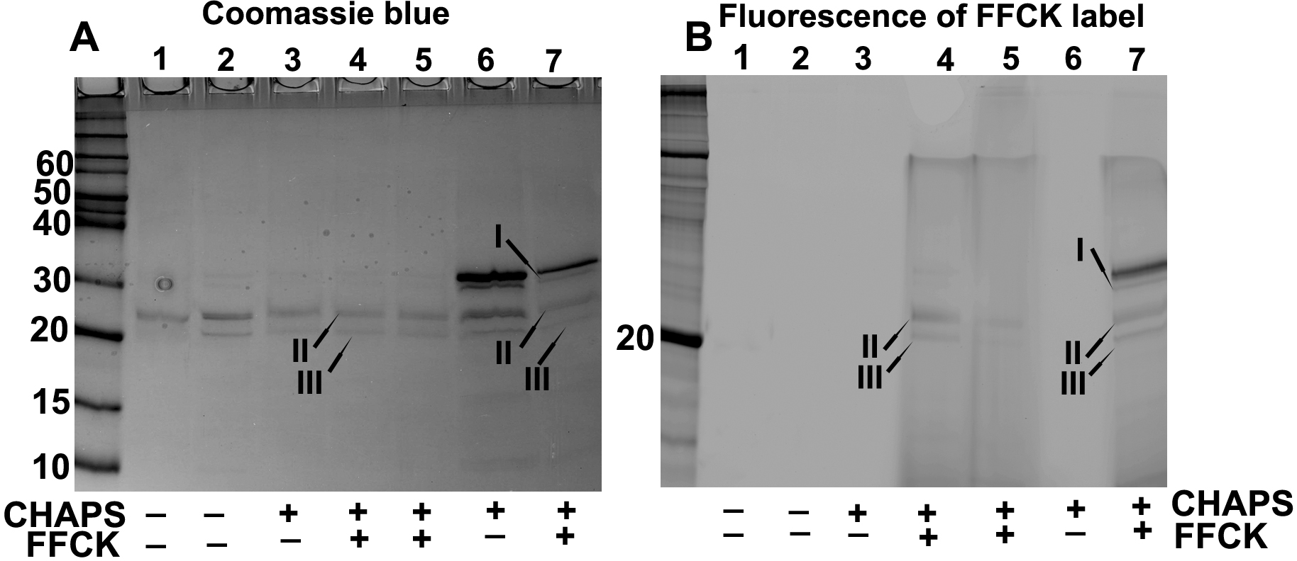 and 27 kDa species) show labeling with FFCK. The untruncated