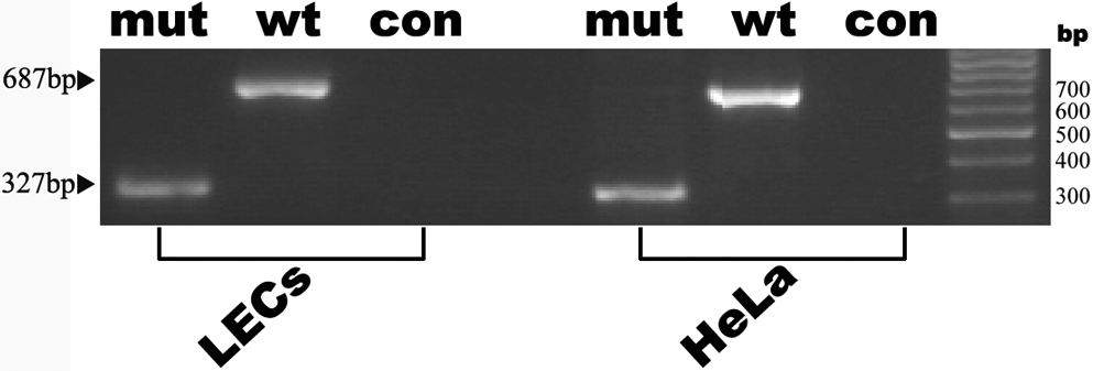 and pTARGET-mut shows a 687 bp band and a 327 bp band, respectively. The pTARGET-col used as a control shows a negative band.