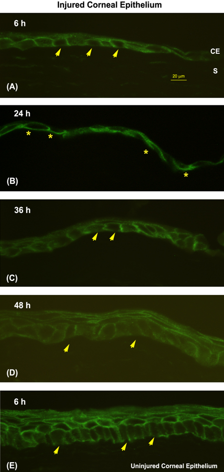 reepithelialization. The pattern of PMCA4 IR is shown in the wound margin at 6 h (A), 24 h (B), 36 h (C), and 48 h (D), and in the control cornea at 6 h (E). The presence (asterisks) or absence (arrows) of basal plasma membrane staining in representative cells is shown (corneal