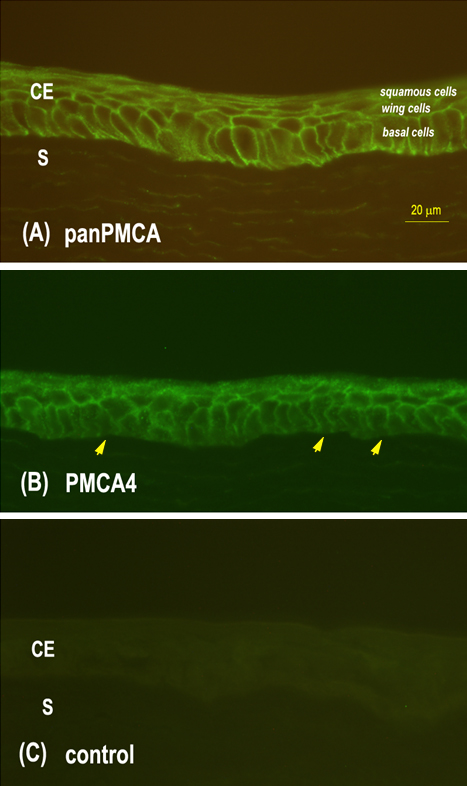 Figure 5. Localization of plasma membrane calcium-ATPase (PMCA) in rabbit corneal epithelium (CE). A: Immunostaining with pan-PMCA antibody revealed strong PMCA labeling in all layers of the CE. The staining was associated