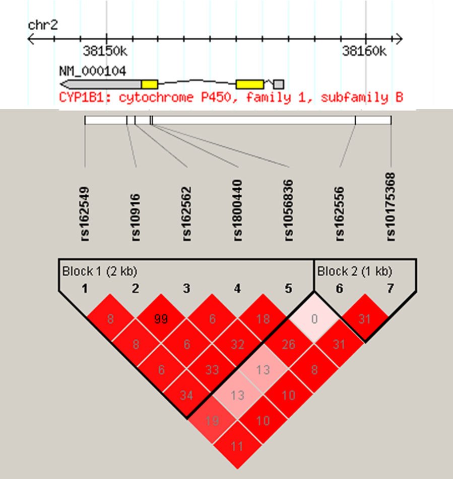 2 values are given in the intersecting boxes, with darker colors indicating stronger linkage disequilibrium. The position of