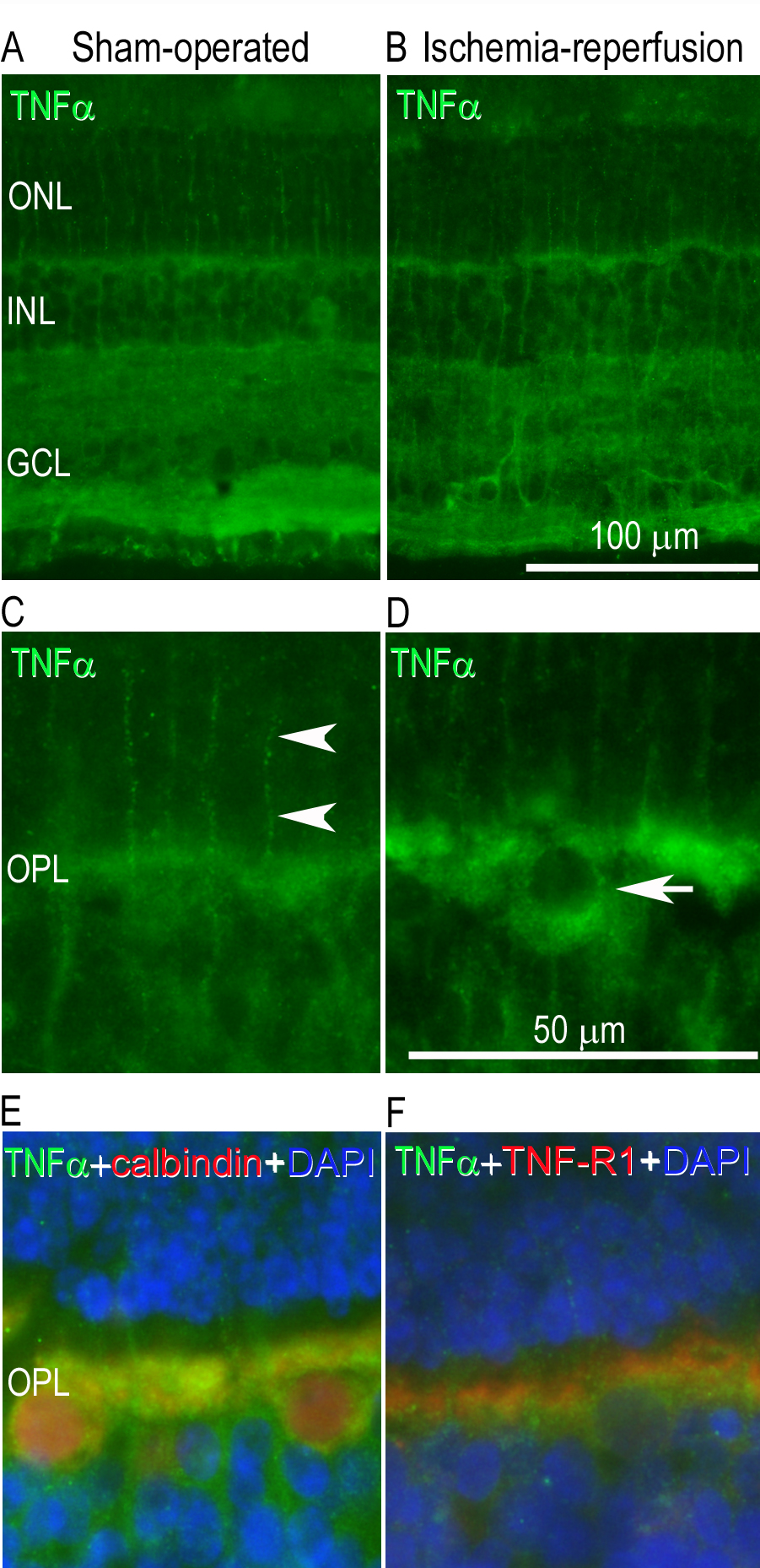 outer plexiform layer and in the Müller cells of the neuroretina in (A) a sham-operated eye and (B) the fellow eye subjected to ischemia and 12 h of reperfusion. C-D: Enlargement showing TNF-α staining in the (C) Müller cell processes (arrow heads) and (D) cellbodies of the outer plexiform layer (arrow). E: Enlargement showing double staining with TNF-α and calbindin (a horizontal cell marker) and (F) TNF-α with its receptor TNF receptor 1 (TNF-R1). DAPI was used to label the cell nuclei. The different images are from separate