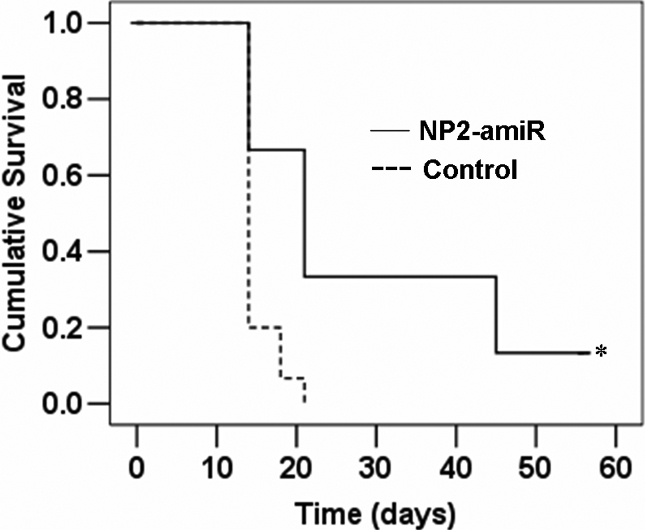 Figure 4. Effect of NP2 inhibition by NP2-amiR on survival of high-risk allogeneic corneal transplants. Kaplan–Meier analysis showing significant