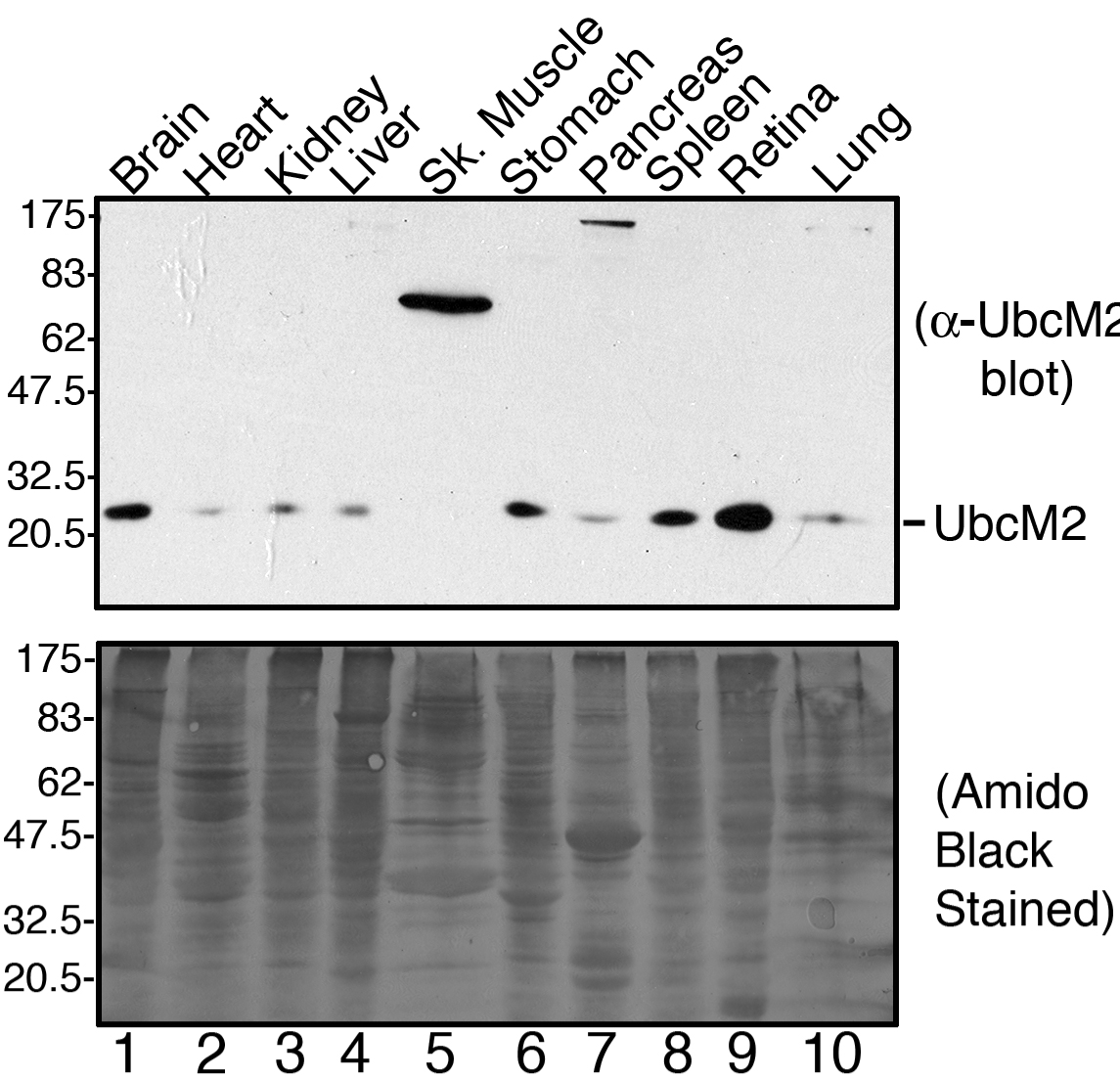 skeletal muscle, stomach, pancreas, spleen, retina, and lung of a 7-month-old mouse were subjected to anti-UbcM2 western blotting