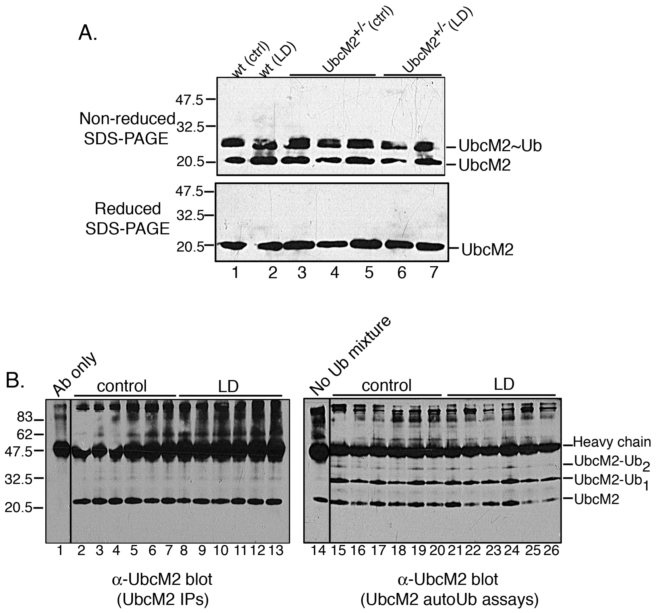 wt mice (lanes 1 and 2) and UbcM2+/− mice (lanes 3–7)