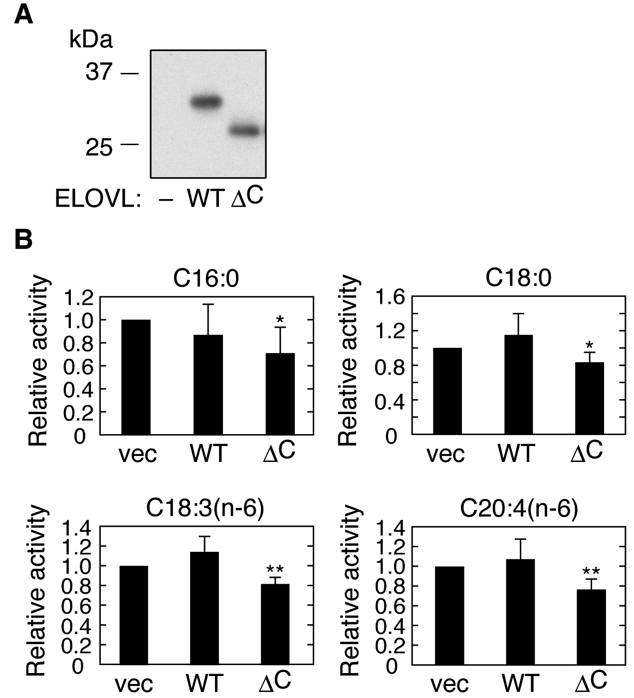 significant differences compared to vector-transfected cells are indicated (*p<0.05, **p<0.01; t-test). Abbreviations: WT represents wild-type; ΔC represents ELOVL4ΔC; vec represents vector.