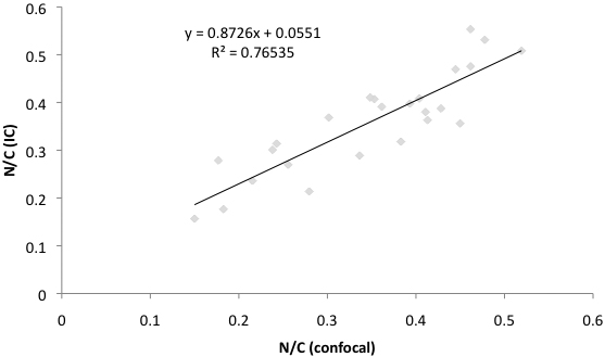 The correlation of nucleocytoplasmic (N/C) ratio assessed by impression cytology and in vivo confocal microscopy. Note the linear positive correlation for N/C ratio assessed by both examination techniques.