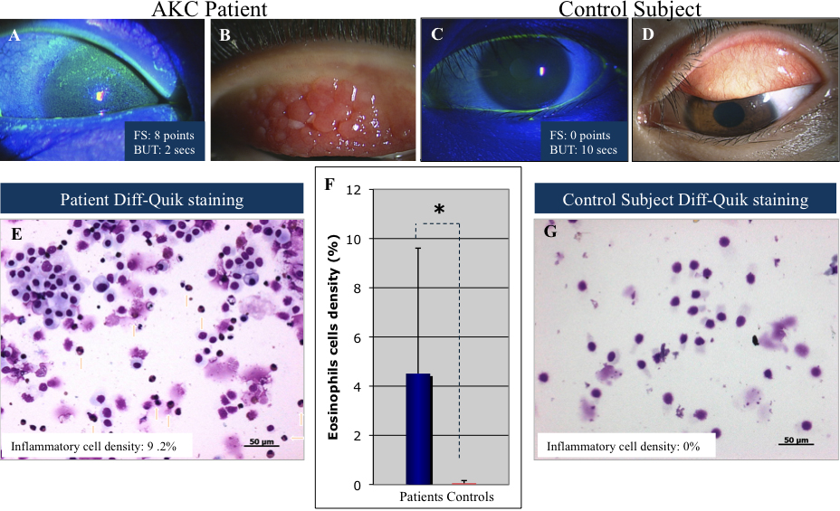 (C, D). Note the extensive inflammatory infiltrates in Diff-Quik staining from brush cytology samples in the AKC patient (E) compared with the healthy control subject (G). The graphic shows the comparison of mean percentage inflammatory cells stained by DQ between the two groups (F).