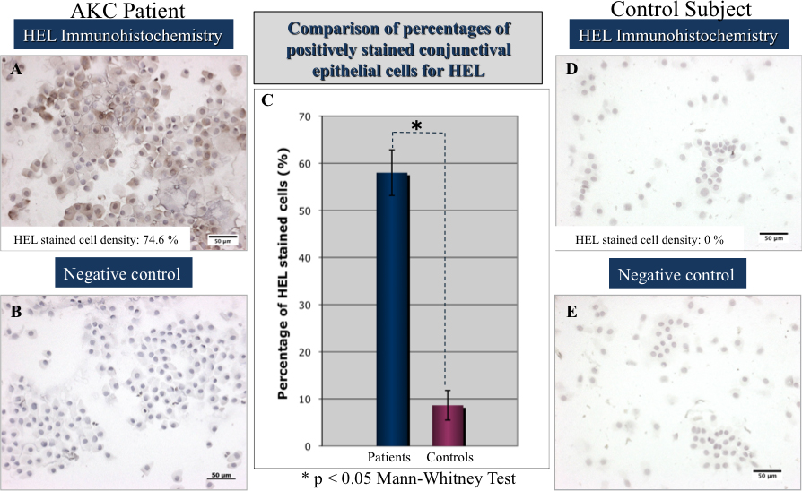 brush cytology samples of an AKC patient (A) compared to the healthy control subject (D). Note the significantly higher percentage of cells stained by HEL in patients with AKC (C). B and E represent the negative controls from the immunohistochemistry.