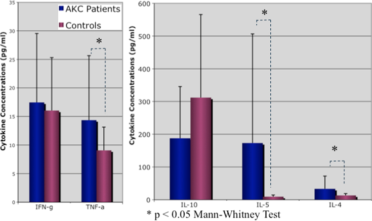 Comparison of tear cytokine levels between AKC patients and age and sex matched healthy control subjects.