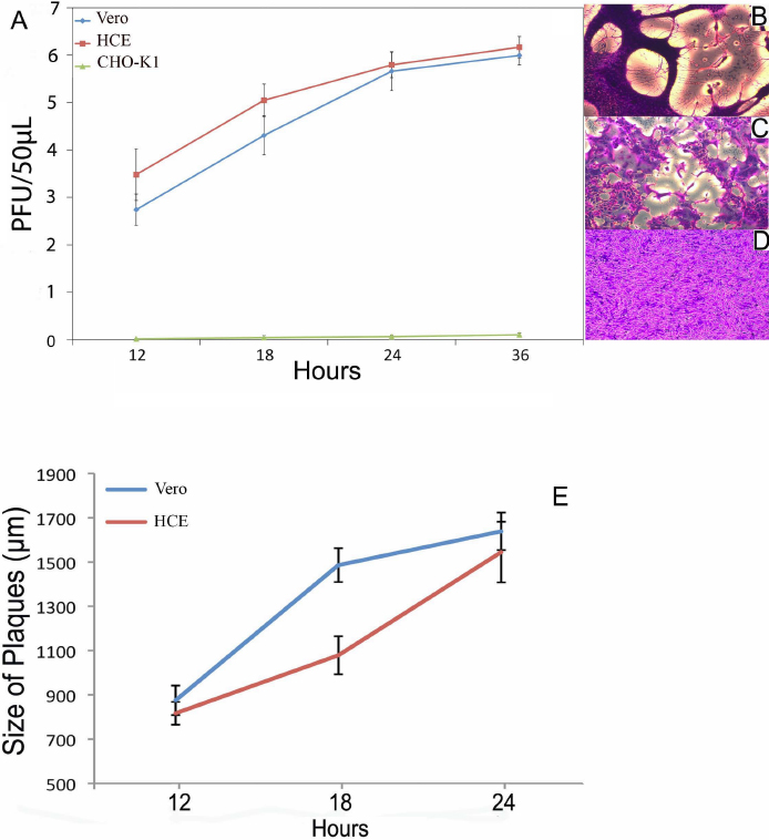 at 0, 12, 18, 24, and 36 h. Data represents the mean of three samples (±SD). A typical plaque formed by Vero and HCE cells