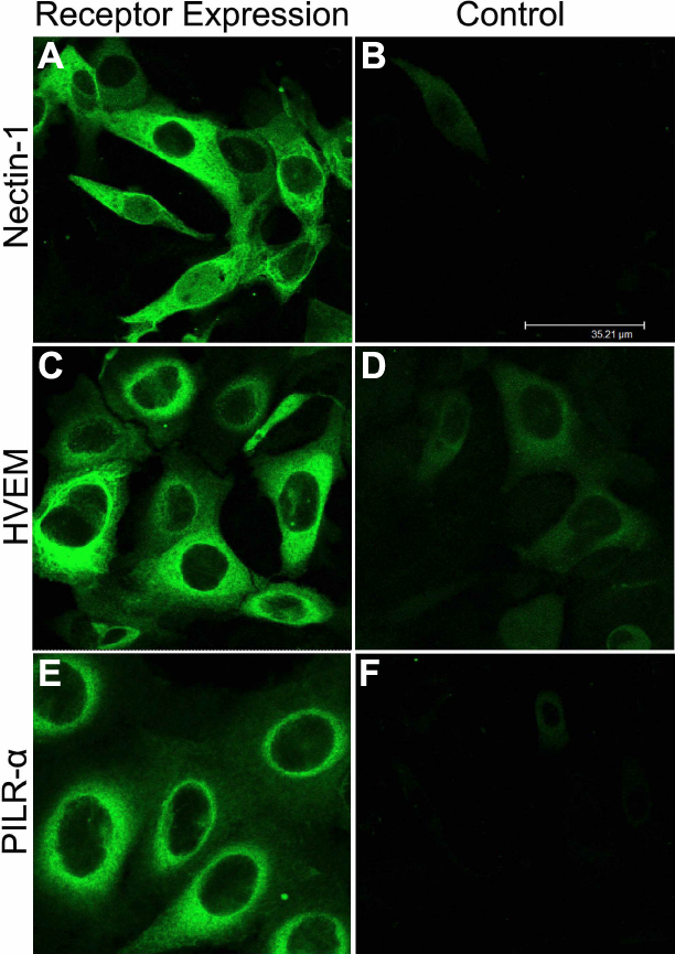 (Leica SP20). Cells were blocked for 90 min, washed, and then either mock treated with buffer alone (B, D, F) or treated with primary antibodies for Nectin-1 (A), HVEM (C), and PILR-alpha (E). Images were taken after the incubation of HCE cells with FITC-conjugated secondary antibodies. Staining of cells with green