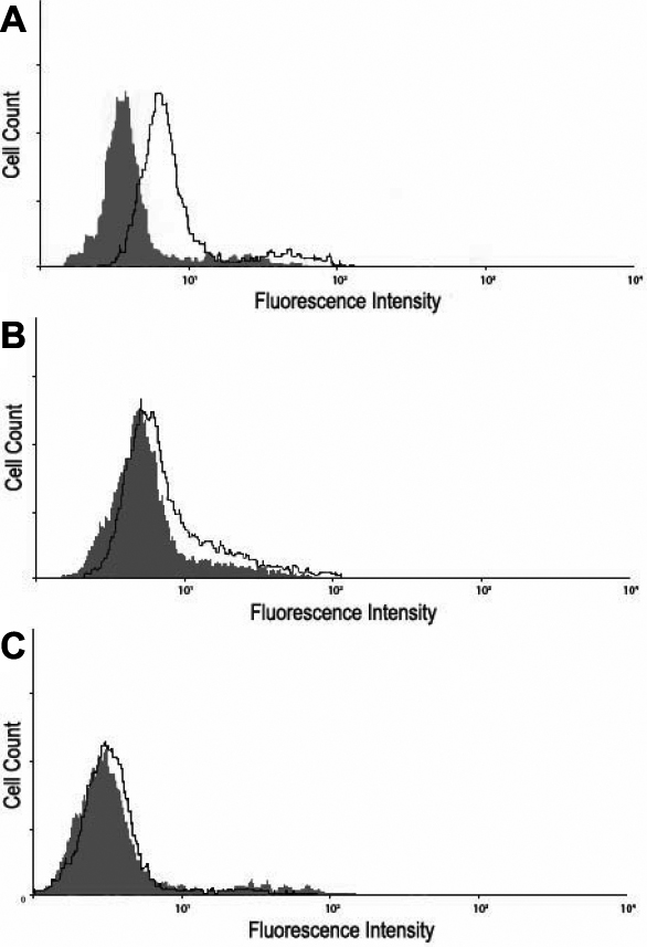 (FACS) analysis. Cells were treated with primary antibodies to Nectin-1 (A), HVEM (B), or PILR-alpha (C). HCE cells stained only with FITC-conjugated secondary antibody were used as background controls and are shown as the dark