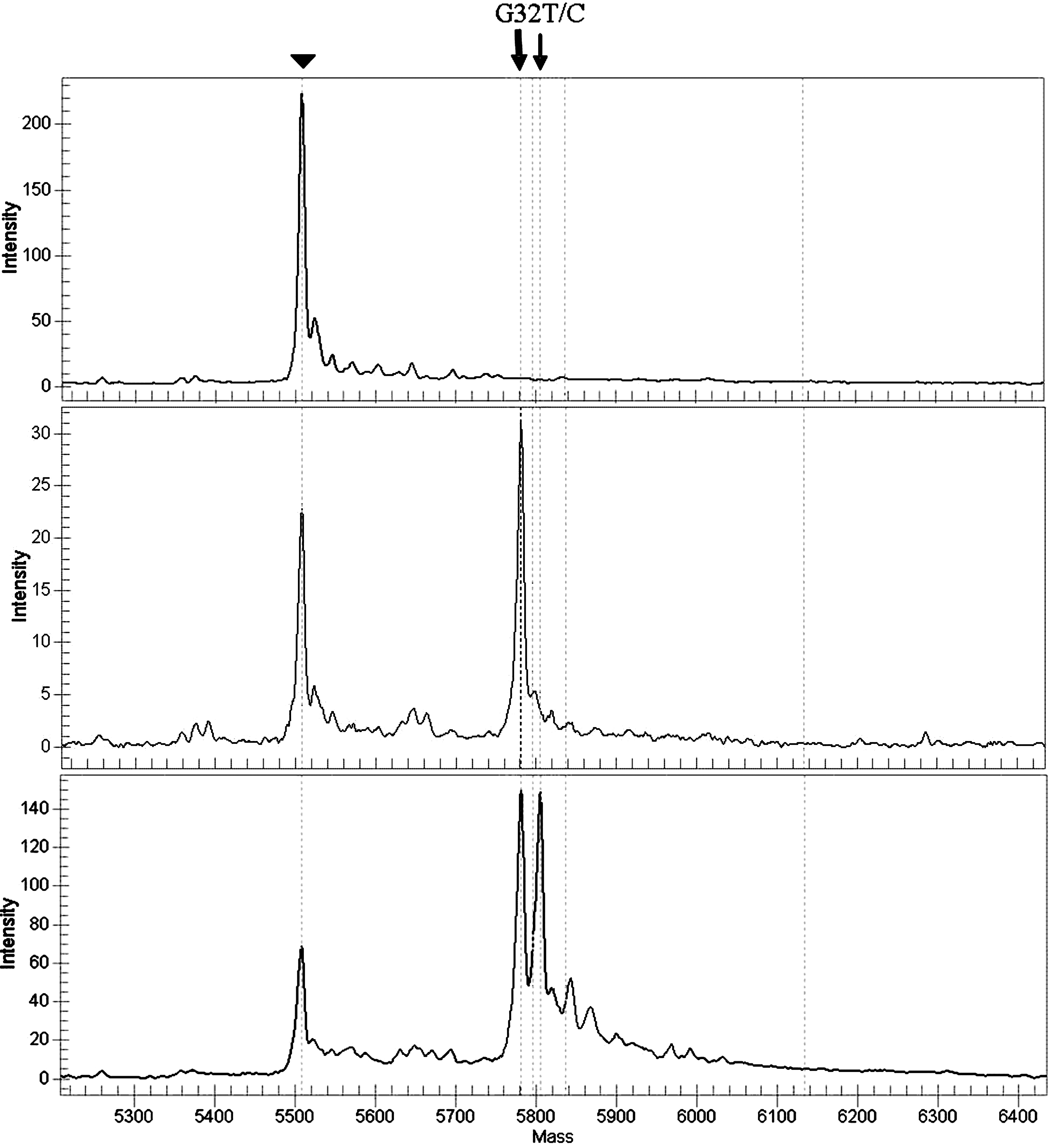 the MALDI-TOF technique and were used as positive controls for the G32T