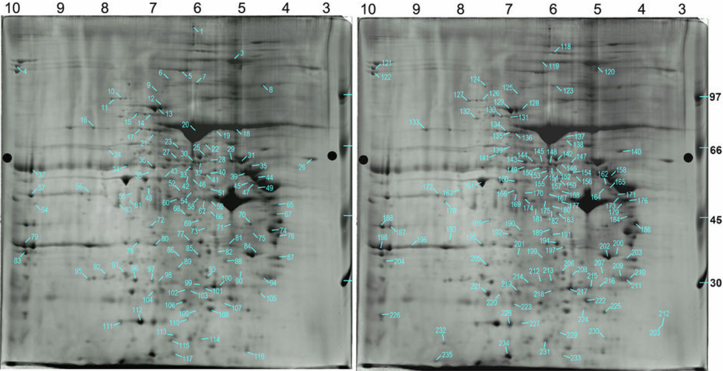 from the 2-DE gel of human TMT are localized on two images, where spots 1–117 are located on the left and 118–235 on the right.