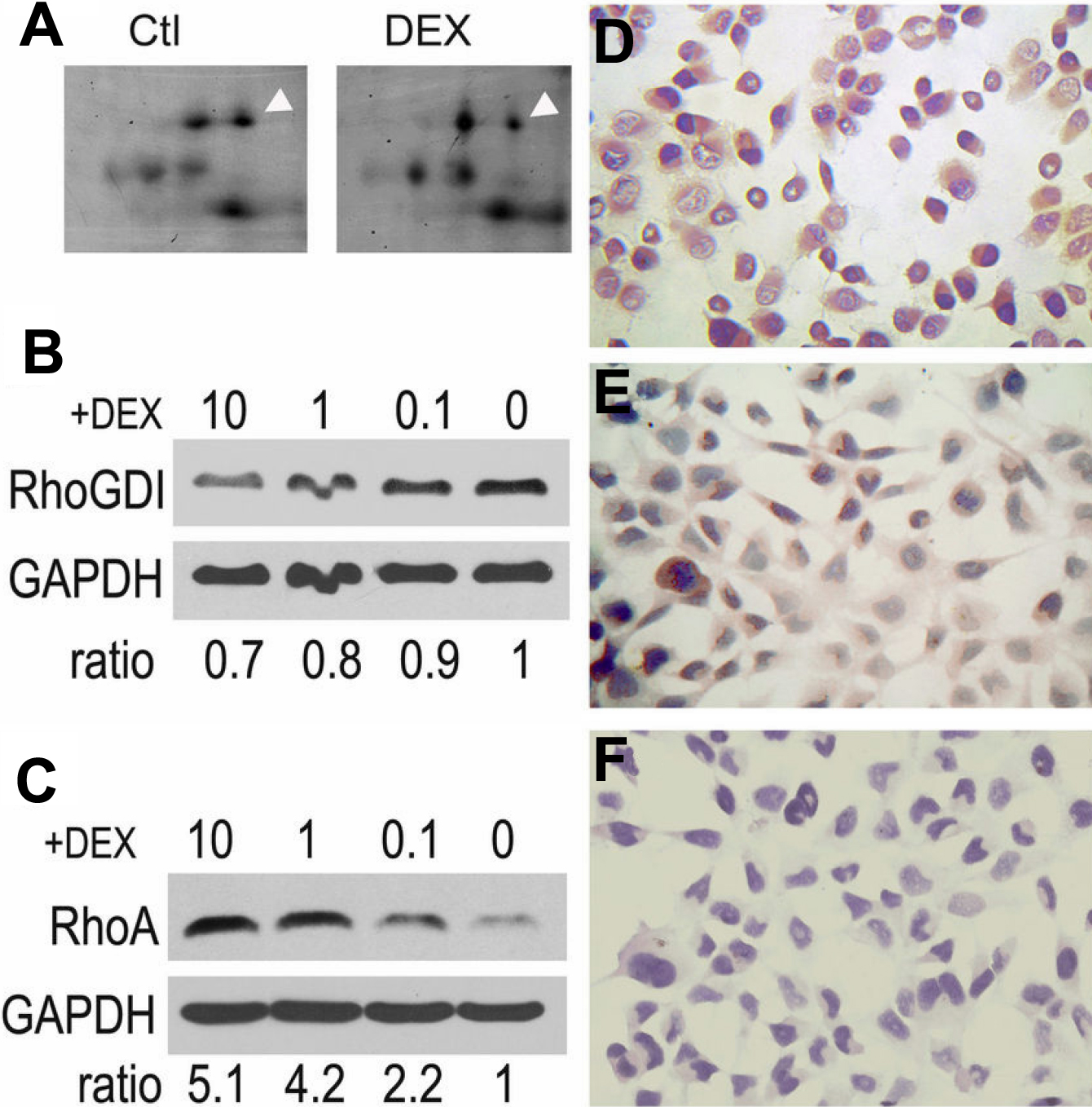 that RhoGDI displayed weaker expression in DEX-treated TMCs (E) than did the cells without DEX (D). Image F was a mock staining control.