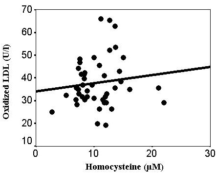 Plasma concentrations of oxidized low-density lipoprotein (oxidized LDL) versus homocysteine levels in control subjects (r=0.123, p=0.422).