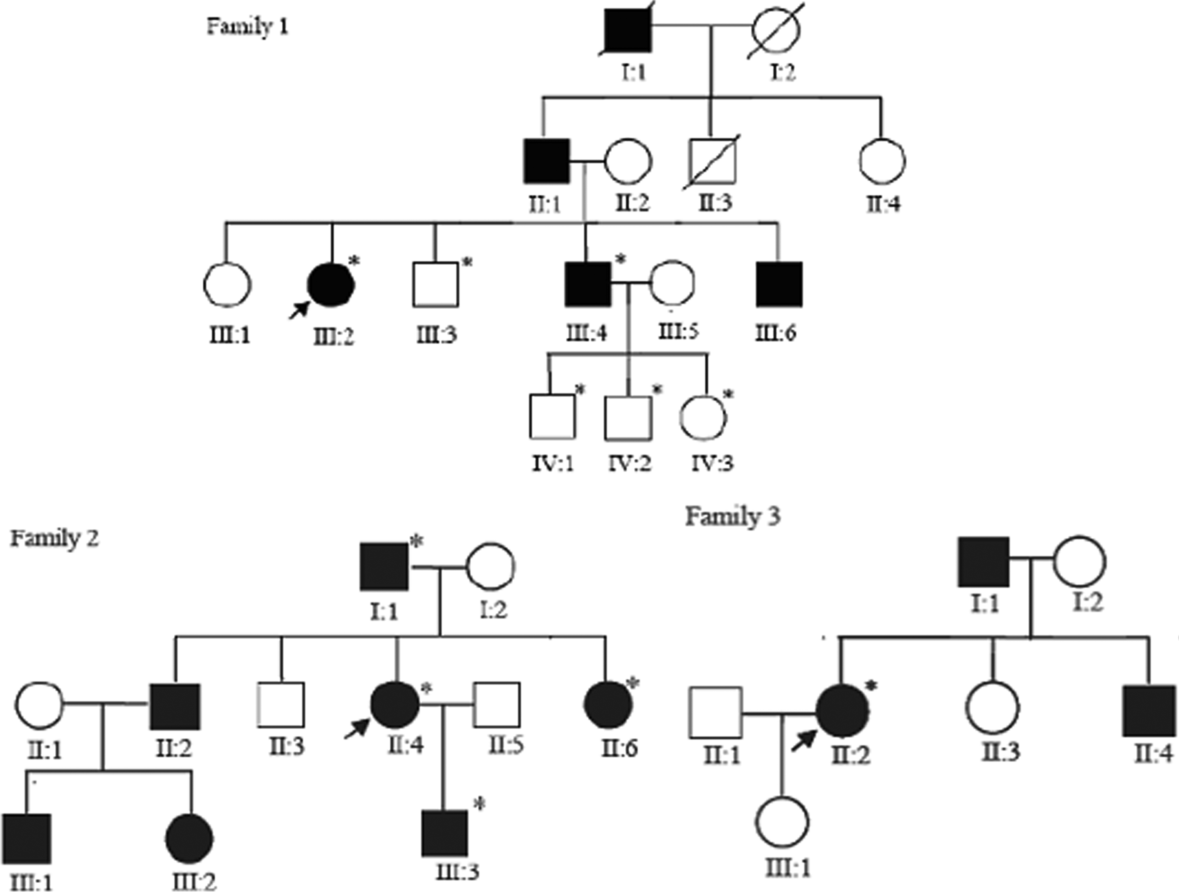 Pedigrees of Family 1, 2, and 3. The closed symbols represent individuals affected by the LCD and the open symbols represent those who are unaffected. Arrowheads denote probands. Asterisks point to members analyzed in the study.