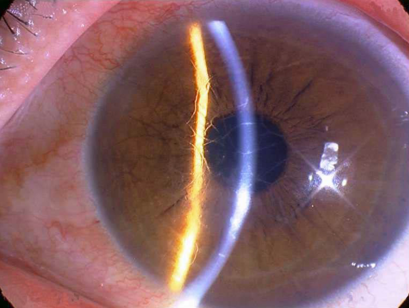 The proband of Family 3(II-2) at the 38 years of age with thin linear irregular branching refractile lines and white dots deposition in the subepithelial and stromal layers. Visual impairment was not obvious.